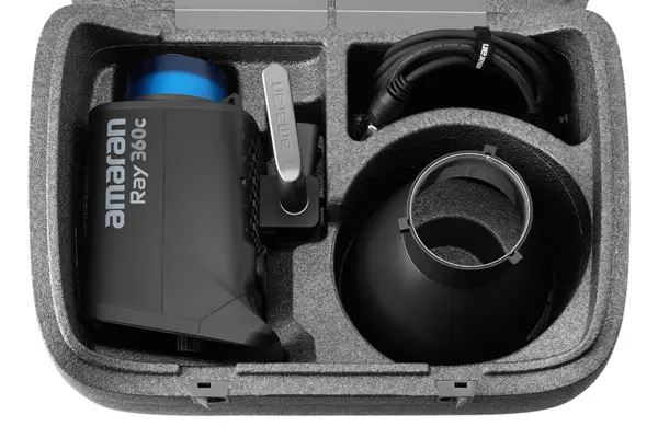 amaran Ray 360c は、360W の AC 駆動を採用したフルカラー対応の高出力ポイント光源 LED モノライトです。IP54 の防塵・防滴設計と高い色再現性を備え、スタジオ撮影、ポッドキャスト、ミュージックビデオなど幅広い用途に対応します。色温度は通常 2300〜10,000K、CCT+ モードでは 1800〜20,000K まで拡張可能で、HSI・RGB による 360°フルカラー制御や 12 種類の FX エフェクトを搭載。OmniColor エンジンにより高輝度かつ自然な肌色再現を実現し、CRI95 などの高評価を獲得しています。本体操作は TFT 画面と FlowTurn ノブで直感的に行え、NFC によるアプリ連携や Bluetooth 制御にも対応。電源内蔵の一体型設計で、静音ファンと Bowens マウントにより、実用性と拡張性を兼ね備えた照明機材です。