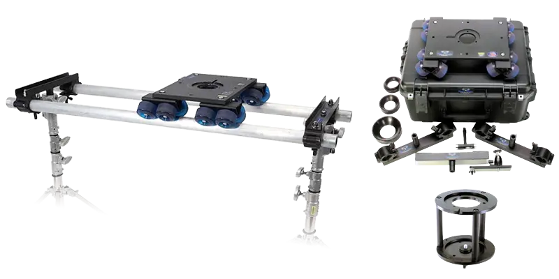 Dana Dolly Portable Dolly Systemは、アルミニウム構造で迅速かつ組立も容易な、ポータブルドリーシステムです。75mm、100mm、150mmボールヘッドアダプタ、ライザーが付属、多くのヘッドの装着が可能です。通常のミニスライダーに比べ、重量のあるカメラの搭載が可能です。耐荷重は約45.4 kgです。高さの調整が必要な場合は、オプションのMatthews The Slider Standをご使用ください。