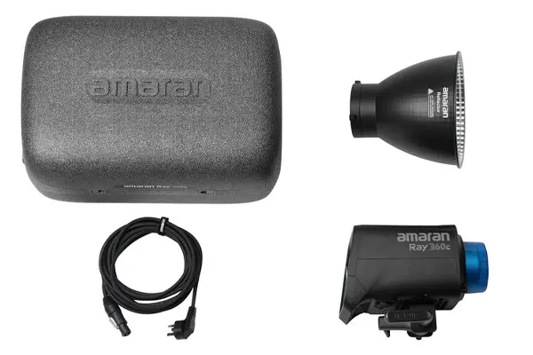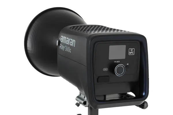 amaran Ray 360c は、360W の AC 駆動を採用したフルカラー対応の高出力ポイント光源 LED モノライトです。IP54 の防塵・防滴設計と高い色再現性を備え、スタジオ撮影、ポッドキャスト、ミュージックビデオなど幅広い用途に対応します。色温度は通常 2300〜10,000K、CCT+ モードでは 1800〜20,000K まで拡張可能で、HSI・RGB による 360°フルカラー制御や 12 種類の FX エフェクトを搭載。OmniColor エンジンにより高輝度かつ自然な肌色再現を実現し、CRI95 などの高評価を獲得しています。本体操作は TFT 画面と FlowTurn ノブで直感的に行え、NFC によるアプリ連携や Bluetooth 制御にも対応。電源内蔵の一体型設計で、静音ファンと Bowens マウントにより、実用性と拡張性を兼ね備えた照明機材です。